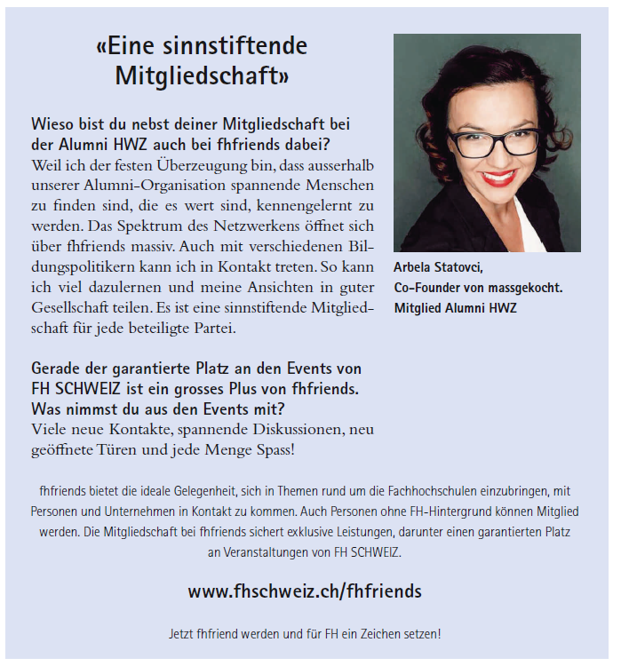 «Als Unternehmerin sind mir Bildung, Forschung und Innovation enorm wichtig. Ich durfte eine top Weiterbildung an der HWZ geniessen und sehe mich in der Verpflichtung Botschafterin eines solchen ausgezeichneten Dachverbandes zu sein.»