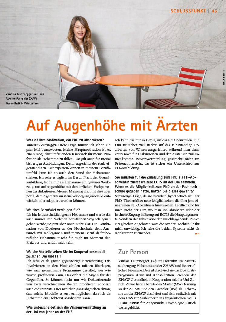 Ausbildung: Fachmatur (Gesundheit) Fachrichtung Studium: BSc Hebamme, MSc Nursing Sience, PhD Care and Rehab Sciences Institution & Ort: ZHAW, ZHAW, UZH Weiterbildung: CAS Ausbilden in Organisationen, IAP