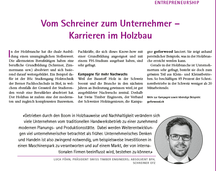 Berufslehre: Schreiner weitere Ausbildung: BSc Holztechnik Fachrichtung Studium: Holztechnik Institution & Ort: BFH Abschlussjahr Studium: 2020 Weiterbildungen: gerade an einem MBA dran
